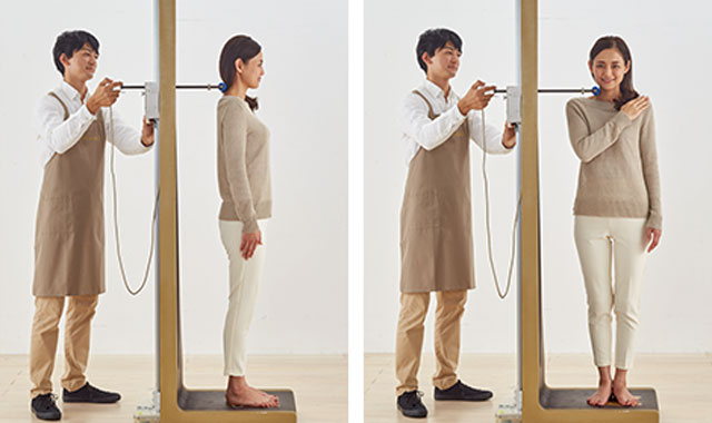 西川株式会社が開発したオリジナルの測定器で、立位姿勢を測定。